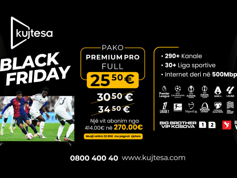 Pako Premium Pro Pakoja më komplete jo vetëm në Kosovë por edhe në rajon është pakoja Premium Pro me internet shpejtësi marramendës dhe stabil, pako e cila sot kategorizohet ndër pakot më të kompletuara pasi që përmban më shumë se 300 kanale, nga të cilat vetëm kanale të sportit janë mbi 40, shumë kanale me filma nga platfromat e ndryshme të filmave dokumentar e plot kanale me përmbajtje të larmishme dhe eksluzive. Kujtesa me pakon Premium Pro ofron ekskluzivisht DGA me kanalet Top Channel, … si dhe eksluzivisht Premier ligën, Ligën e kampioneve, La liga, Bundesliga, Ligue 1, Princ caffe superligën në basketboll, Formula 1, Moto GP, etj..